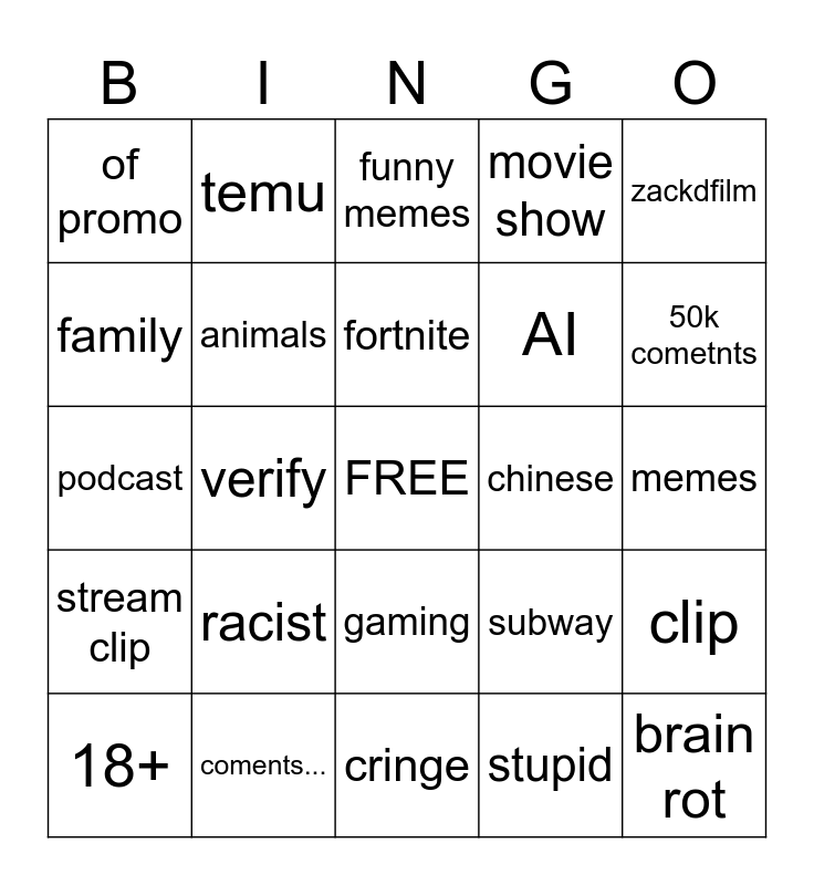 This bingo card has a free space and 24 words: racist, coments..., fortnite, 18+, zackdfilm, of promo, family, temu, chinese, gaming, AI, podcast, subway, clip, animals, stupid, memes, funny memes, 50k cometnts, verify, brain rot, stream clip, movie show and cringe.