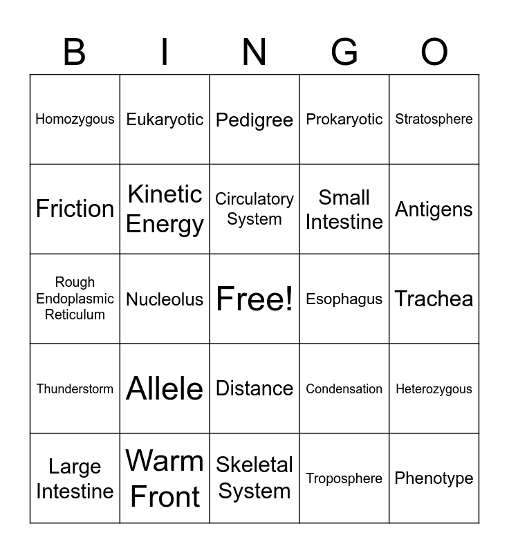 This bingo card has a free space and 24 words: Allele, Warm Front, Circulatory System, Large Intestine, Stratosphere, Homozygous, Friction, Eukaryotic, Esophagus, Distance, Small Intestine, Rough Endoplasmic Reticulum, Condensation, Heterozygous, Kinetic Energy, Troposphere, Trachea, Pedigree, Antigens, Nucleolus, Phenotype, Thunderstorm, Prokaryotic and Skeletal System.