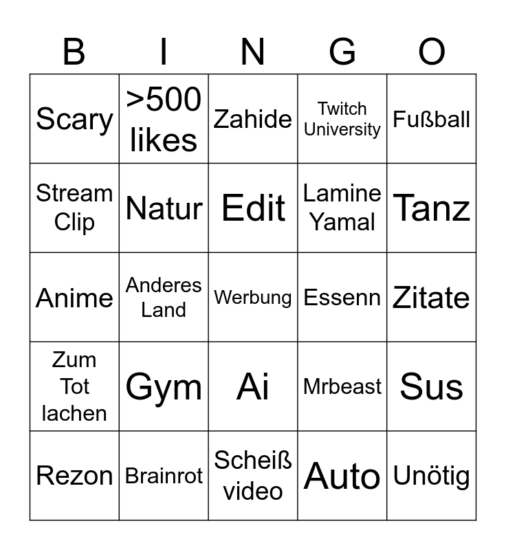 This bingo card has a free space and 24 words: Gym, Brainrot, Edit, Rezon, Fußball, Scary, Stream Clip, >500 likes, Essenn, Ai, Lamine Yamal, Anime, Mrbeast, Sus, Natur, Auto, Zitate, Zahide, Tanz, Anderes Land, Unötig, Zum Tot lachen, Twitch University and Scheiß video.