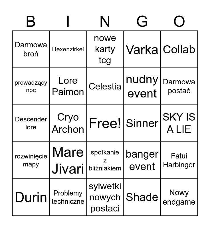 This bingo card has a free space and 37 words: stream > 30min, stream < 30min, zwiastun Nod-Krai, Lore Paimon, Fatui Harbinger, Mare Jivari, Celestia, lore ksieżycy, Collab, Pyro gnoza, Cryo Archon, Varka, Nowy endgame, SKY IS A LIE, prowadzący npc, rozwinięcie mapy, nowa płyta z muzyką, nowe karty tcg, spotkanie z bliźniakiem, Sinner, Darmowa broń, Darmowa postać, Durin, sylwetki nowych postaci, skiny, Shade, Hexenzirkel, Anime, prowadzący VA, event anegdotkowy, Chronicled Wish baner, Problemy techniczne, Descender lore, Rework baneru, banger event, nudny event and Cosiek nie rozpoznaje głosu postaci.