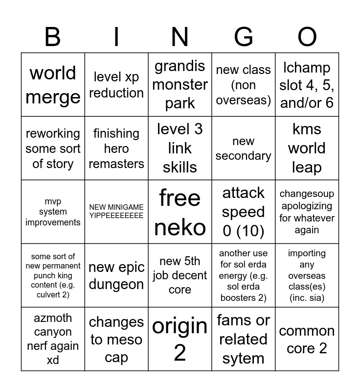 This bingo card has a free space and 49 words: extreme damien/ damien remaster, common core 2, hexa stat 4, origin 2, new epic dungeon, level cap increase (300+), level xp reduction, level 295+ area(s), reworking some sort of story, resistance remasters, finishing hero remasters, new class (non overseas), importing any overseas class(es) (inc. sia), another use for sol erda energy (e.g. sol erda boosters 2), new boss, new boss difficulties (e.g. xlimbo or xbaldrix), level 3 link skills, attack speed 0 (10), more boss crystal changes, lchamp slot 4, 5, and/or 6, NEW MINIGAME YIPPEEEEEEEE, fams or related sytem, world merge, new secondary, next brilliant boss set item, kms world leap, azmoth canyon nerf again xd, dojo floor increase or remaster, new 5th job decent core, some sort of new permanent punch king content (e.g. culvert 2), new cube(s), new flame(s), new scroll(s), star force changes, changes to meso cap, new hexa system teased or introduced (like a global hexa link), SSSS tier legion (lvl 275 or something), hyper burning max plus pro, changesoup apologizing for whatever again, new oz ring, new tier of oz rings, max level of sac symbol increased, literally qol, new pitched, mvp system improvements, grandis monster park, kms frag daily or weekly, class balancing and boss nerfs.