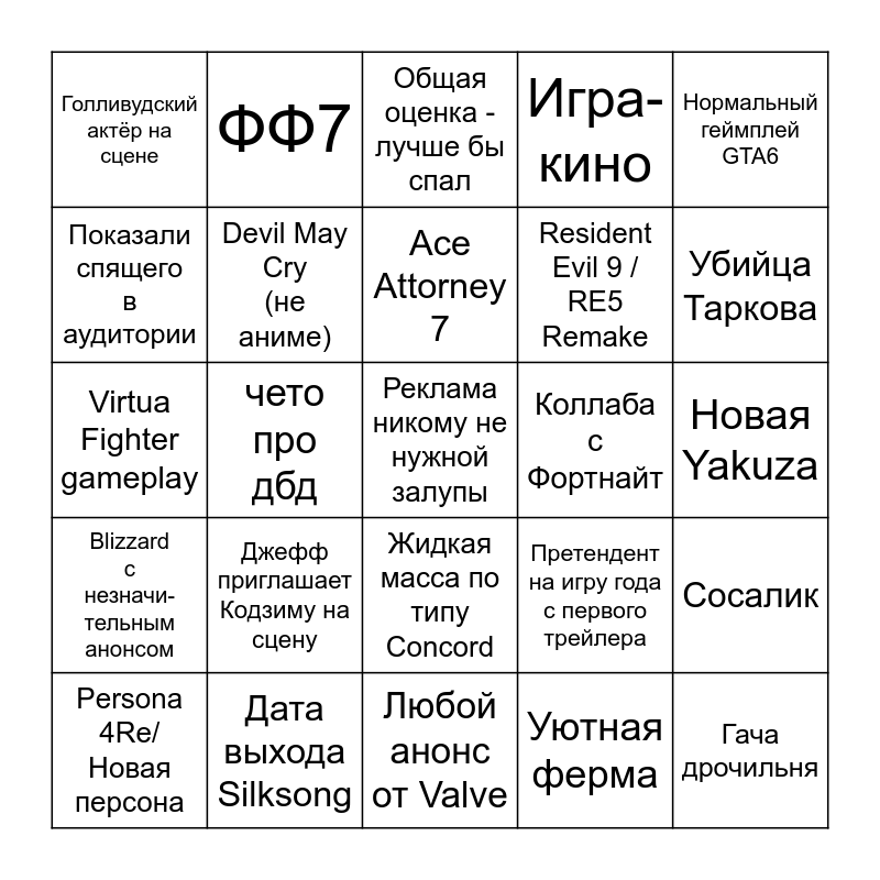 This bingo card has 25 words: Джефф приглашает Кодзиму на сцену, Любой анонс от Valve, Ace Attorney 7, Persona 4Re/ Новая персона, Нормальный геймплей GTA6, Голливудский актёр на сцене, Показали спящего в аудитории, ФФ7, Коллаба с Фортнайт, Жидкая масса по типу Concord, Resident Evil 9 / RE5 Remake, Virtua Fighter gameplay, Претендент на игру года с первого трейлера, Сосалик, Devil May Cry (не аниме), Гача дрочильня, Новая Yakuza, Общая оценка - лучше бы спал, Убийца Таркова, чето про дбд, Реклама никому не нужной залупы, Дата выхода Silksong, Blizzard с незначи-тельным анонсом, Игра-кино and Уютная ферма.