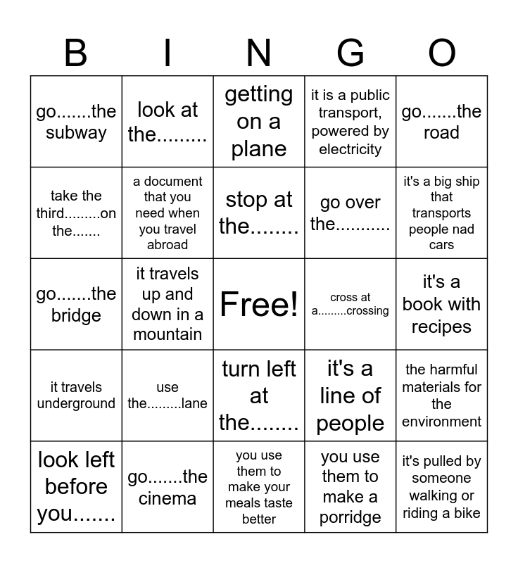 This bingo card has a free space and 24 words: use the.........lane, go.......the cinema, stop at the........, look left before you......., go.......the road, go.......the subway, take the third.........on the......., look at the........., cross at a.........crossing, turn left at the........, go over the..........., go.......the bridge, it's a line of people, the harmful materials for the environment, a document that you need when you travel abroad, you use them to make a porridge, it's a book with recipes, getting on a plane, it's a big ship that transports people nad cars, it travels up and down in a mountain, it's pulled by someone walking or riding a bike, it travels underground, it is a public transport, powered by electricity and you use them to make your meals taste better.