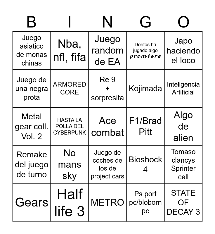 This bingo card has a free space and 24 words: No mans sky, Half life 3, Re 9 + sorpresita, Gears, Japo haciendo el loco, Juego asiatico de monas chinas, Juego de una negra prota, Nba, nfl, fifa, F1/Brad Pitt, Juego de coches de los de project cars, Kojimada, Metal gear coll. Vol. 2, Bioshock 4, Tomaso clancys Sprinter cell, ARMORED CORE, Ps port pc/bloborn pc, Algo de alien, Juego random de EA, Inteligencia Artificial, HASTA LA POLLA DEL CYBERPUNK, STATE OF DECAY 3, Remake del juego de turno, Doritos ha jugado algo 𝓹𝓻𝓮𝓶𝓲𝓮𝓻𝓮 and METRO.