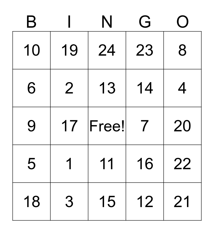 This bingo card has a free space and 24 words: 1, 3, 13, 18, 8, 10, 6, 19, 7, 11, 14, 9, 16, 22, 2, 12, 20, 24, 4, 17, 21, 5, 23 and 15.