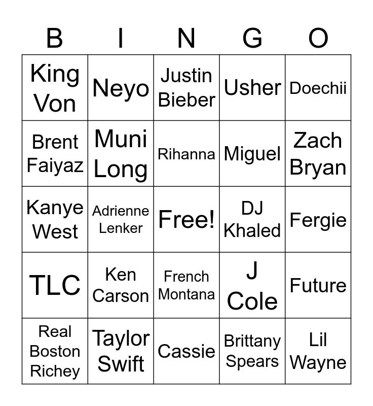 This bingo card has a free space and 24 words: Ken Carson, Taylor Swift, Rihanna, Real Boston Richey, Doechii, King Von, Brent Faiyaz, Neyo, DJ Khaled, French Montana, Miguel, Kanye West, J Cole, Future, Muni Long, Brittany Spears, Fergie, Justin Bieber, Zach Bryan, Adrienne Lenker, Lil Wayne, TLC, Usher and Cassie.