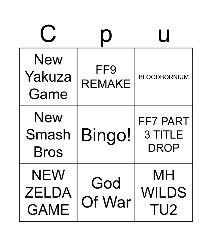 This bingo card has a free space and 8 words: FF7 PART 3 TITLE DROP, BLOODBORNIUM, FF9 REMAKE, NEW ZELDA GAME, New Yakuza Game, MH WILDS TU2, New Smash Bros and God Of War.