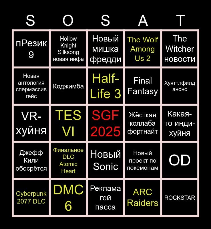 This bingo card has a free space and 24 words: Финальное DLC Atomic Heart, DMC 6, Half-Life 3, Cyberpunk 2077 DLC, The Witcher новости, пРезик 9, Новая антология спермассив гейс, Hollow Knight Silksong новая инфа, Жёсткая коллаба фортнайт, Новый Sonic, Final Fantasy, VR-хуйня, Новый проект по покемонам, OD, Коджимба, ARC Raiders, Какая-то инди-хуйня, Новый мишка фредди, Хуяттлфилд анонс, TES VI, ROCKSTAR, Джефф Кили обосрётся, The Wolf Among Us 2 and Реклама гей пасса.