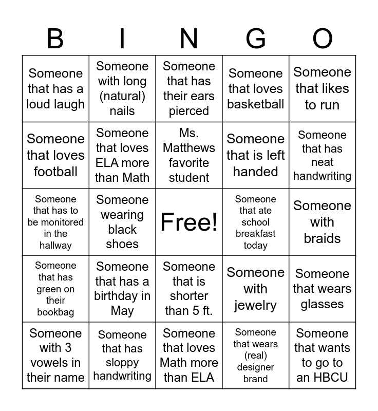 This bingo card has a free space and 24 words: Someone that has a birthday in May, Someone that has sloppy handwriting, Ms. Matthews favorite student, Someone with 3 vowels in their name, Someone that likes to run, Someone that has a loud laugh, Someone that loves football, Someone with long (natural) nails, Someone that ate school breakfast today, Someone that is shorter than 5 ft., Someone that is left handed, Someone that has to be monitored in the hallway, Someone with jewelry, Someone that wears glasses, Someone that loves ELA more than Math, Someone that wears (real) designer brand, Someone with braids, Someone that has their ears pierced, Someone that has neat handwriting, Someone wearing black shoes, Someone that wants to go to an HBCU, Someone that has green on their bookbag, Someone that loves basketball and Someone that loves Math more than ELA.