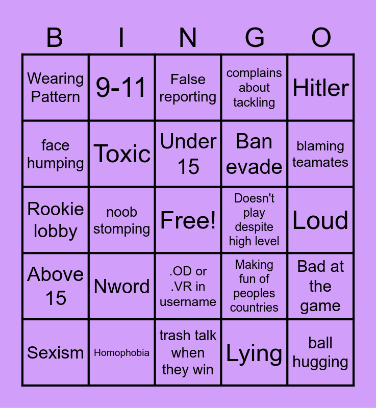 This bingo card has a free space and 24 words: Nword, Homophobia, Under 15, Sexism, Hitler, Wearing Pattern, face humping, 9-11, Doesn't play despite high level, .OD or .VR in username, Ban evade, Rookie lobby, Making fun of peoples countries, Bad at the game, Toxic, Lying, Loud, False reporting, blaming teamates, noob stomping, ball hugging, Above 15, complains about tackling and trash talk when they win.