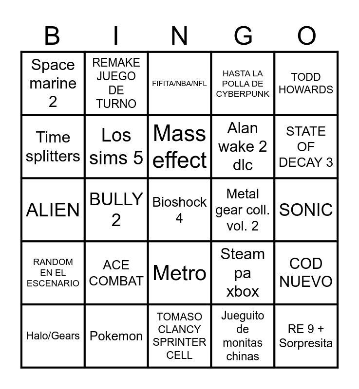 This bingo card has a free space and 44 words: No mans sky, RE 9 + Sorpresita, F1/BRAD PITT o PELI MAGIC, Halo/Gears, Inteligencia Artificial, Jueguito de monitas chinas, FIFITA/NBA/NFL, CARRERITAS (PROJECT CARS), TODD HOWARDS, Pokemon, HASTA LA POLLA DE CYBERPUNK, Metal gear coll. vol. 2, Metro, ACE COMBAT, ARMORED CORE, TOMASO CLANCY SPRINTER CELL, PS PORT PC, ALIEN, JUEGO RANDOM DE EA, STATE OF DECAY 3, REMAKE JUEGO DE TURNO, DORITOS HA JUGADO ALGO 𝓹𝓻𝓮𝓶𝓲𝓮𝓻𝓮, HALF LIFE 3, Space marine 2, Juego prota negra, SONIC, BLOBORN, KOJIMADA, Steam pa xbox, RANDOM EN EL ESCENARIO, DINO CRISIS, COD NUEVO, NUEVA XBOX, PlayStation All-Stars Battle Royale 2, BULLY 2, JET SET RADIO NUEVO, RESISTANCE O KILLZONE, Parasite del eva remaqe, Mass effect, Time splitters, Alan wake 2 dlc, Prince of persia, Los sims 5 and 5 noches en el fredis.