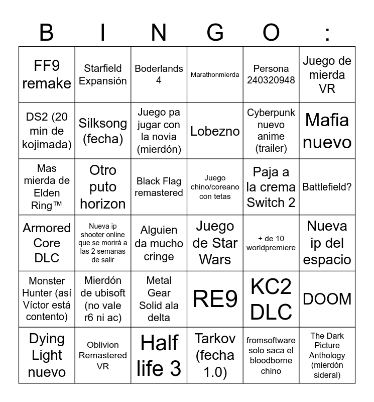 This bingo card has 36 words: RE9, Metal Gear Solid ala delta, Tarkov (fecha 1.0), DS2 (20 min de kojimada), Armored Core DLC, Juego chino/coreano con tetas, Silksong (fecha), Half life 3, Persona 240320948, KC2 DLC, Mafia nuevo, Marathonmierda, DOOM, Otro puto horizon, Lobezno, FF9 remake, Monster Hunter (así Víctor está contento), Paja a la crema Switch 2, Mas mierda de Elden Ring™, Boderlands 4, Black Flag remastered, Nueva ip shooter online que se morirá a las 2 semanas de salir, Juego de Star Wars, Alguien da mucho cringe, + de 10 worldpremiere, Starfield Expansión, Cyberpunk nuevo anime (trailer), Oblivion Remastered VR, Juego pa jugar con la novia (mierdón), Juego de mierda VR, The Dark Picture Anthology (mierdón sideral), Dying Light nuevo, Nueva ip del espacio, Battlefield?, Mierdón de ubisoft (no vale r6 ni ac) and fromsoftware solo saca el bloodborne chino.