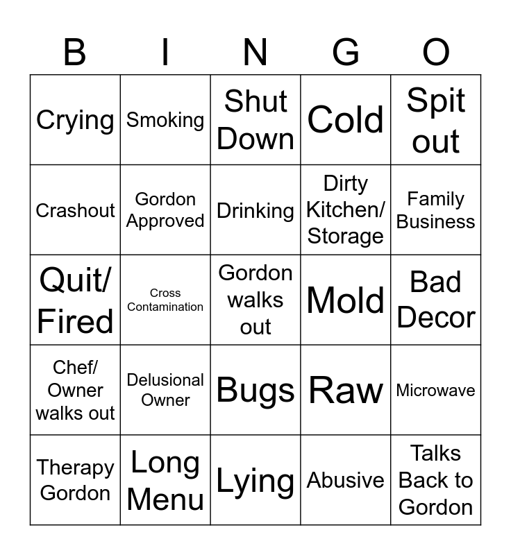 This bingo card has 25 words: Delusional Owner, Lying, Drinking, Therapy Gordon, Spit out, Crying, Crashout, Smoking, Mold, Bugs, Dirty Kitchen/ Storage, Quit/ Fired, Raw, Microwave, Gordon Approved, Talks Back to Gordon, Bad Decor, Shut Down, Family Business, Cross Contamination, Gordon walks out, Long Menu, Chef/ Owner walks out, Cold and Abusive.