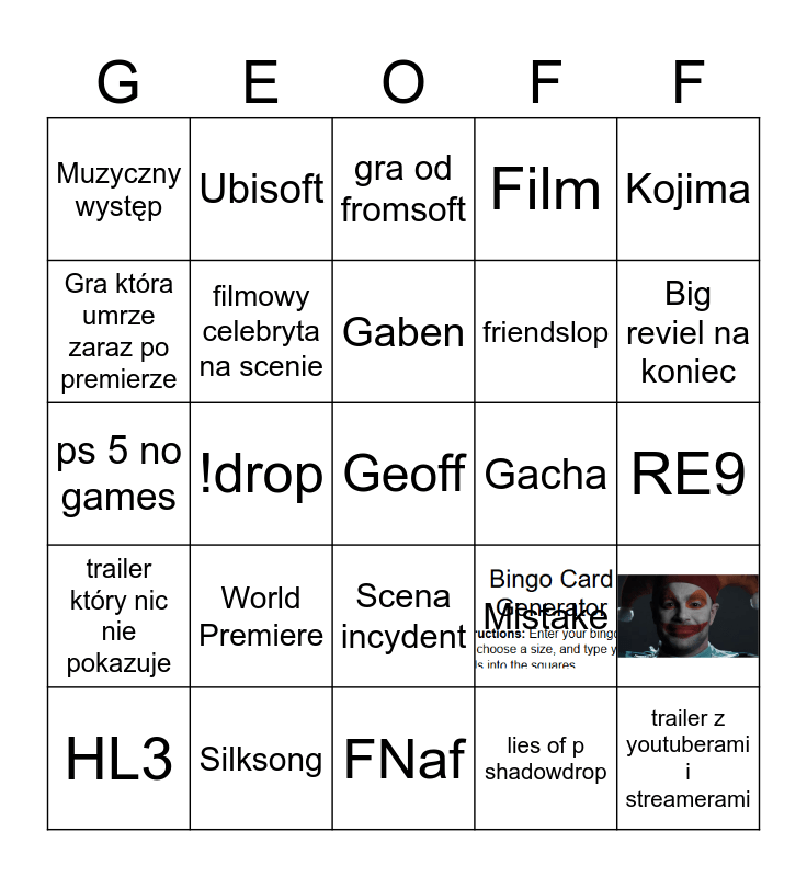 This bingo card has 2 images, a free space and 23 words: World Premiere, Silksong, Gaben, HL3, Kojima, Muzyczny występ, Gra która umrze zaraz po premierze, Ubisoft, Gacha, Scena incydent, friendslop, ps 5 no games, Mistake, filmowy celebryta na scenie, lies of p shadowdrop, RE9, gra od fromsoft, Big reviel na koniec, !drop, trailer z youtuberami i streamerami, trailer który nic nie pokazuje, Film and FNaf.