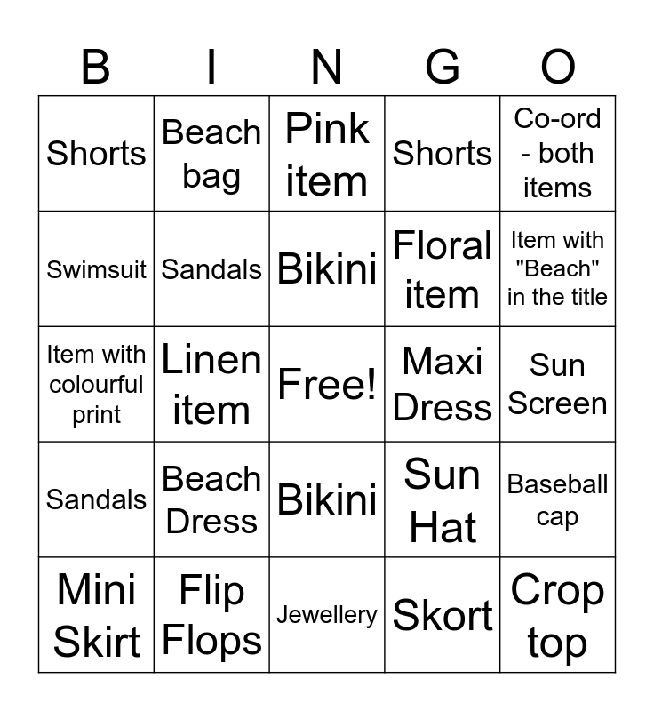 This bingo card has a free space and 24 words: Beach Dress, Flip Flops, Bikini, Mini Skirt, Co-ord - both items, Shorts, Swimsuit, Beach bag, Maxi Dress, Bikini, Floral item, Item with colourful print, Sun Hat, Baseball cap, Sandals, Skort, Sun Screen, Pink item, Item with "Beach" in the title, Linen item, Crop top, Sandals, Shorts and Jewellery.