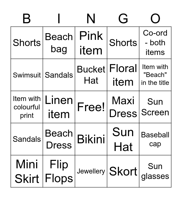 This bingo card has a free space and 24 words: Beach Dress, Flip Flops, Bucket Hat, Mini Skirt, Co-ord - both items, Shorts, Swimsuit, Beach bag, Maxi Dress, Bikini, Floral item, Item with colourful print, Sun Hat, Baseball cap, Sandals, Skort, Sun Screen, Pink item, Item with "Beach" in the title, Linen item, Sun glasses, Sandals, Shorts and Jewellery.