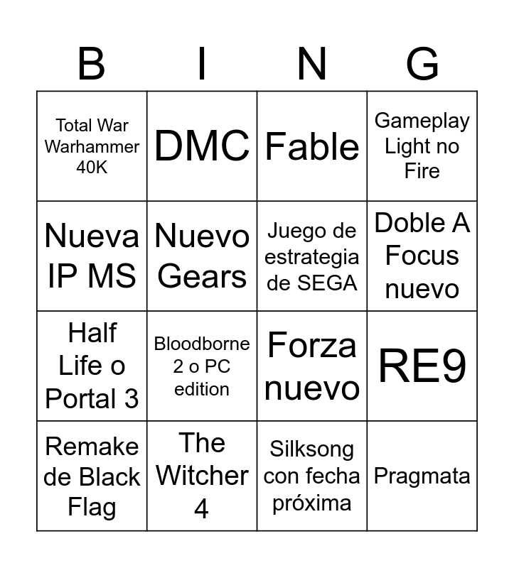 This bingo card has 16 words: The Witcher 4, RE9, Fable, Total War Warhammer 40K, Half Life o Portal 3, DMC, Forza nuevo, Silksong con fecha próxima, Nueva IP MS, Nuevo Gears, Remake de Black Flag, Gameplay Light no Fire, Bloodborne 2 o PC edition, Doble A Focus nuevo, Juego de estrategia de SEGA and Pragmata.