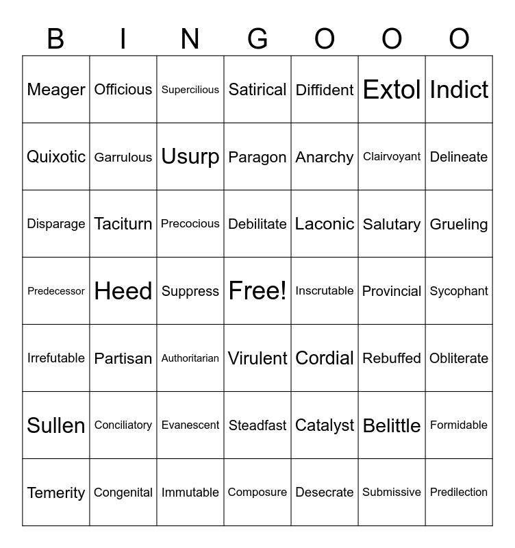 This bingo card has a free space and 100 words: Aesthetic, Catalyst, Disparage, Ingratiate, Insipid, Peerless, Propriety, Virtuoso, Vitriolic, Whimsical, Amicable, Devious, Immutable, Predecessor, Efface, Rebuffed, Garrulous, Static, Ponderous, Dissonance, Acquiesce, Articulate, Belittle, Bombastic, Conciliatory, Delineate, Diffident, Laconic, Scanty, Subjugate, Anarchy, Meager, Turbulence, Temerity, Suppress, Quixotic, Salutary, Depravity, Authoritarian, Predilection, Desecrate, Evanescent, Paragon, Provincial, Usurp, Supercilious, Indigent, Steadfast, Callous, Heed, Incorrigible, Irrefutable, Partisan, Buoyant, Enervate, Inexorable, Marred, Parochial, Pique, Satirical, Cajole, Capitulate, Egregious, Premonition, Prestigious, Reverent, Stupor, Sycophant, Urbane, Zany, Inscrutable, Precocious, Trepidation, Aberration, Composure, Congenital, Elusive, Extol, Formidable, Virulent, Accommodate, Clairvoyant, Contiguous, Debilitate, Obliterate, Officious, Preclude, Spurn, Stealthy, Taciturn, Cordial, Defame, Discordant, Grueling, Indict, Indoctrinate, Submissive, Sullen, Thwart and Wanton.