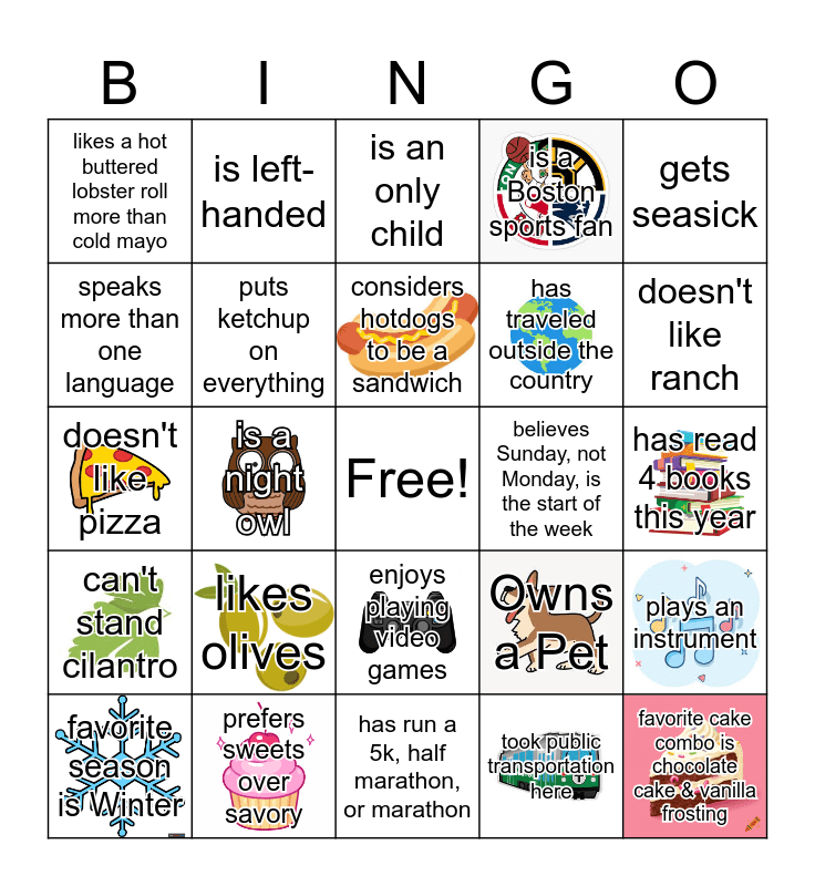 This bingo card has 17 images, a free space and 27 words: Owns a Pet, moved here out of state, has traveled outside the country, has run a 5k, half marathon, or marathon, speaks more than one language, is an only child, is left-handed, can't stand cilantro, believes Sunday, not Monday, is the start of the week, plays an instrument, doesn't like pizza, is a Boston sports fan, favorite season is Winter, prefers sweets over savory, doesn't like ranch, likes country music, puts ketchup on everything, considers hotdogs to be a sandwich, likes olives, likes a hot buttered lobster roll more than cold mayo, has read 4 books this year, took public transportation here, is a night owl, favorite cake combo is chocolate cake & vanilla frosting, enjoys playing video games, gets seasick and absolutely hates mayo.