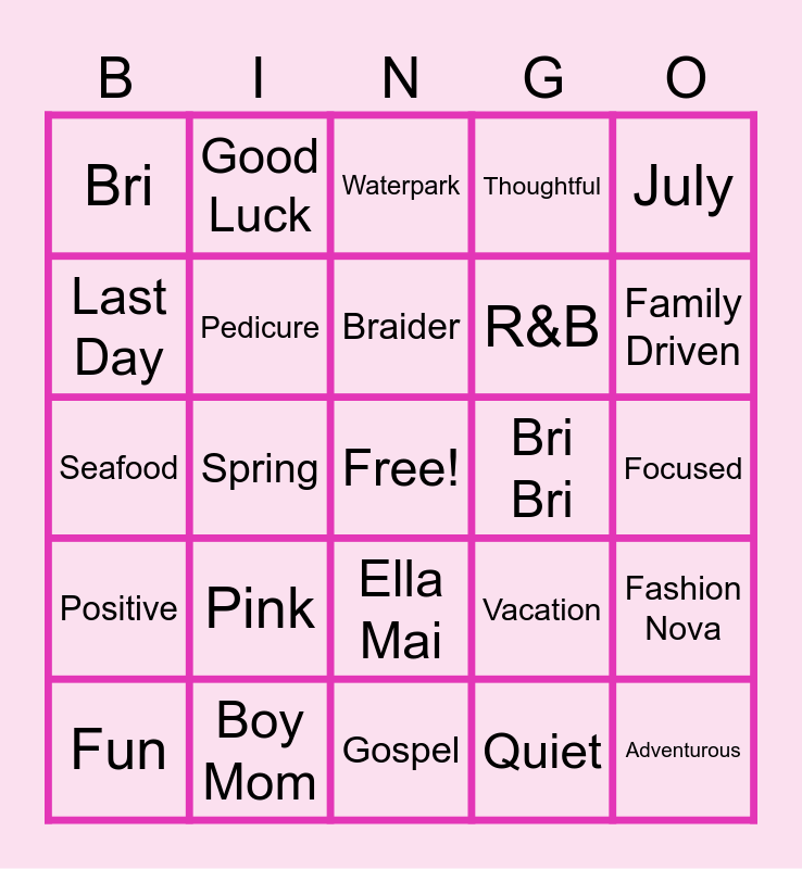 This bingo card has a free space and 24 words: Pink, Boy Mom, Braider, Fun, July, Bri, Last Day, Good Luck, Bri Bri, Ella Mai, R&B, Seafood, Vacation, Fashion Nova, Pedicure, Quiet, Focused, Waterpark, Family Driven, Spring, Adventurous, Positive, Thoughtful and Gospel.