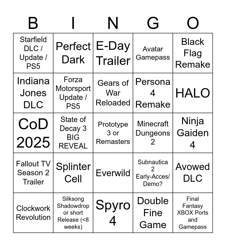 This bingo card has a free space and 24 words: Splinter Cell, Silksong Shadowdrop or short Release (<8 weeks), Gears of War Reloaded, Clockwork Revolution, Black Flag Remake, Starfield DLC / Update / PS5, Indiana Jones DLC, Perfect Dark, Minecraft Dungeons 2, Everwild, Persona 4 Remake, CoD 2025, Subnautica 2 Early-Acces/ Demo?, Avowed DLC, Forza Motorsport Update / PS5, Double Fine Game, Ninja Gaiden 4, E-Day Trailer, HALO, State of Decay 3 BIG REVEAL, Final Fantasy XBOX Ports and Gamepass, Fallout TV Season 2 Trailer, Avatar Gamepass and Spyro 4.