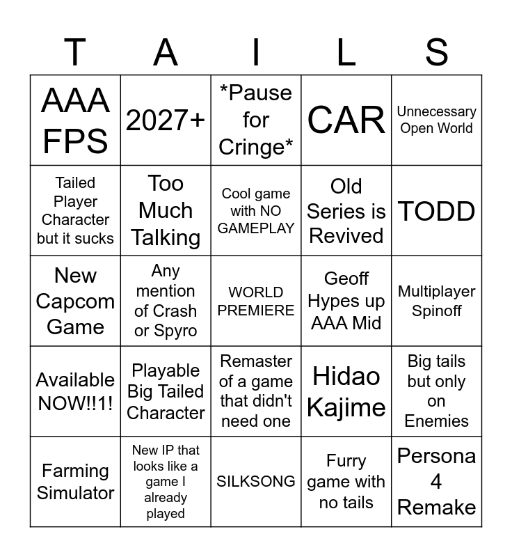 This bingo card has a free space and 24 words: Playable Big Tailed Character, New IP that looks like a game I already played, Cool game with NO GAMEPLAY, Farming Simulator, Unnecessary Open World, AAA FPS, Tailed Player Character but it sucks, 2027+, Geoff Hypes up AAA Mid, Remaster of a game that didn't need one, Old Series is Revived, New Capcom Game, Hidao Kajime, Big tails but only on Enemies, Too Much Talking, Furry game with no tails, Multiplayer Spinoff, *Pause for Cringe*, TODD, Any mention of Crash or Spyro, Persona 4 Remake, Available NOW!!1!, CAR and SILKSONG.