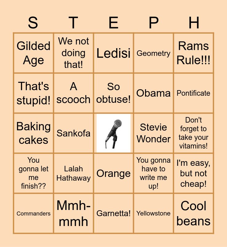 This bingo card has a free space and 27 words: You gonna have to write me up!, Convoluted, Obama, Garnetta!, That's stupid!, Ledisi, We not doing that!, You gonna let me finish??, Stevie Wonder, I'm easy, but not cheap!, Baking cakes, Geometry, Commanders, Mmh-mmh, Pontificate, Hey, Frank!!, A scooch, So obtuse!, Lalah Hathaway, Gilded Age, Don't forget to take your vitamins!, Yellowstone, Sankofa, Cool beans, Orange, Rams Rule!!! and AKA.