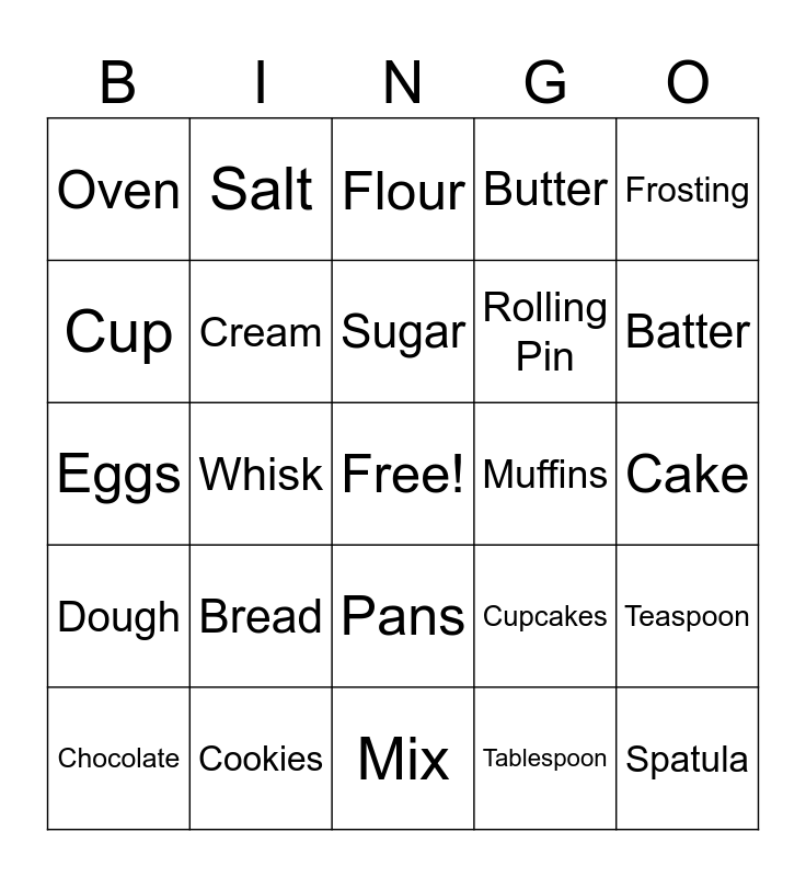 This bingo card has a free space and 24 words: Bread, Cookies, Sugar, Chocolate, Frosting, Oven, Cup, Salt, Muffins, Pans, Rolling Pin, Eggs, Cupcakes, Teaspoon, Cream, Tablespoon, Cake, Flour, Batter, Whisk, Spatula, Dough, Butter and Mix.