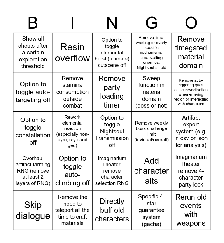 This bingo card has a free space and 24 words: Option to toggle auto-climbing off, Remove the need to teleport all the time to craft materials, Remove party loading timer, Skip dialogue, Remove timegated material domain, Show all chests after a certain exploration threshold, Option to toggle auto-targeting off, Resin overflow, Remove weekly boss challenge limit (invidual/overall), Imaginarium Theater: remove character selection RNG, Sweep function in material domain (boss or not), Option to toggle constellation off, Add character alts, Imaginarium Theater: remove 4-character party lock, Remove stamina consumption outside combat, Specific 4-star guarantee system (gacha), Artifact export system (e.g. in csv or json for analysis), Option to toggle elemental burst (ultimate) cutscene off, Remove auto-triggering quest cutscene/activation when entering region or interacting with characters, Rework elemental reaction (especially non-pyro, cryo and geo), Rerun old events with weapons, Overhaul artifact farming RNG (remove at least 2 layers of RNG), Remove time-wasting or overly specific mechanisms - time-stalling enemies, Nightsoul shield and Directly buff old characters.
