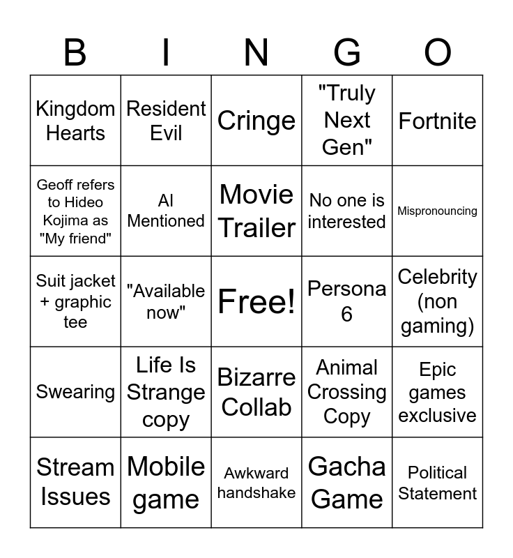 This bingo card has a free space and 24 words: Life Is Strange copy, Mobile game, Movie Trailer, Stream Issues, Fortnite, Kingdom Hearts, Geoff refers to Hideo Kojima as "My friend", Resident Evil, Persona 6, Bizarre Collab, No one is interested, Suit jacket + graphic tee, Animal Crossing Copy, Epic games exclusive, AI Mentioned, Gacha Game, Celebrity (non gaming), Cringe, Mispronouncing, "Available now", Political Statement, Swearing, "Truly Next Gen" and Awkward handshake.