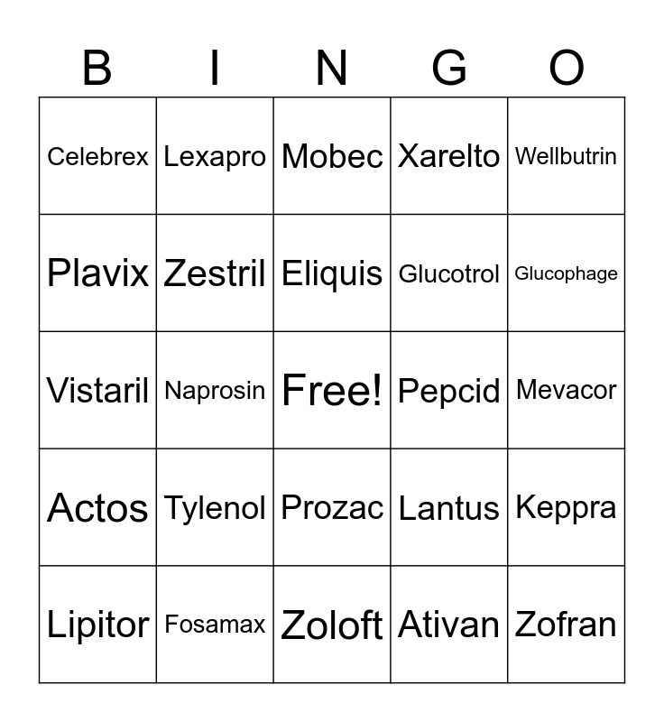 This bingo card has a free space and 24 words: Tylenol, Fosamax, Eliquis, Lipitor, Wellbutrin, Celebrex, Plavix, Lexapro, Pepcid, Prozac, Glucotrol, Vistaril, Lantus, Keppra, Zestril, Ativan, Mevacor, Mobec, Glucophage, Naprosin, Zofran, Actos, Xarelto and Zoloft.