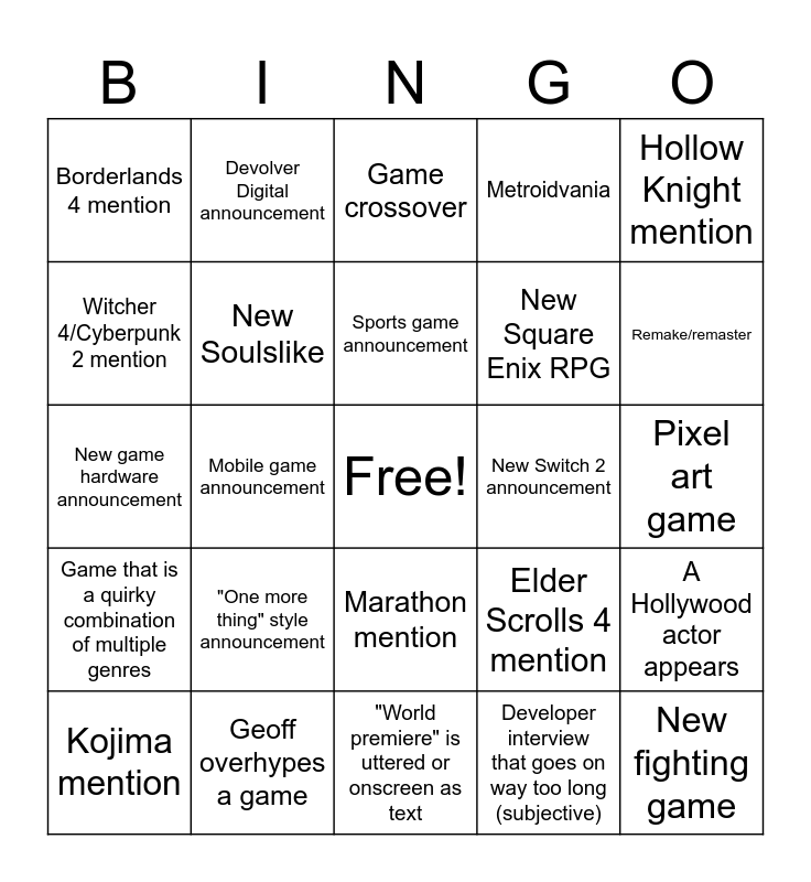 This bingo card has a free space and 24 words: "One more thing" style announcement, Geoff overhypes a game, Sports game announcement, Kojima mention, Hollow Knight mention, Borderlands 4 mention, Witcher 4/Cyberpunk 2 mention, Devolver Digital announcement, New Switch 2 announcement, Marathon mention, New Square Enix RPG, New game hardware announcement, Elder Scrolls 4 mention, A Hollywood actor appears, New Soulslike, Developer interview that goes on way too long (subjective), Pixel art game, Game crossover, Remake/remaster, Mobile game announcement, New fighting game, Game that is a quirky combination of multiple genres, Metroidvania and "World premiere" is uttered or onscreen as text.