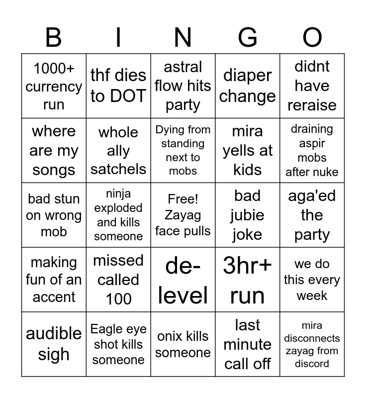 This bingo card has a free space and 24 words: missed called 100, Eagle eye shot kills someone, Dying from standing next to mobs, audible sigh, didnt have reraise, 1000+ currency run, where are my songs, thf dies to DOT, bad jubie joke, de-level, mira yells at kids, bad stun on wrong mob, 3hr+ run, we do this every week, whole ally satchels, last minute call off, aga'ed the party, astral flow hits party, draining aspir mobs after nuke, ninja exploded and kills someone, mira disconnects zayag from discord, making fun of an accent, diaper change and onix kills someone.