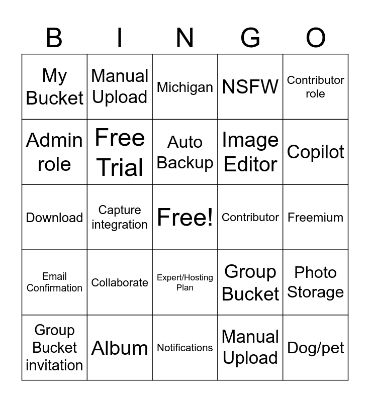 This bingo card has a free space and 65 words: Group Bucket, Album, Memories, Photo Storage, Share Link, Download, Manual Upload, Privacy Policy, Auto Backup, Subscriptions, Expert/Hosting Plan, Free Trial, Freemium, Contributor role, Viewer role, Admin role, Capture integration, My Bucket, Invite Link, Image Editor, Collaborate, Email Confirmation, NSFW, WhatsApp, Copilot, New Hire, Wedding, Baby, Dog/pet, Support/MET team, Group Bucket invitation, Beta, Notifications, Pearl Street, Group Bucket, Album, Share Link, Download, Manual Upload, Auto Backup, Free Trial, Freemium, Contributor, My Bucket, Invite Link, WhatsApp, Copilot, New Hire, Wedding, Baby, Dog/pet, Invitation, Beta/POC, Notifications, Pearl Street, Colorado, Texas, Michigan, Wisconsin, North Carolina, Vegas, Bike, Hike, Road Trip and Vacation.