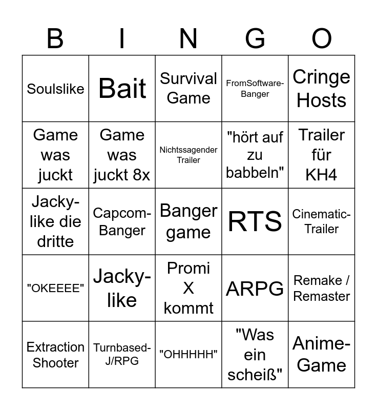 This bingo card has a free space and 24 words: Jacky-like, Turnbased-J/RPG, Nichtssagender Trailer, Extraction Shooter, Cringe Hosts, Soulslike, Game was juckt, Bait, RTS, Promi X kommt, "hört auf zu babbeln", Jacky-like die dritte, ARPG, Remake / Remaster, Game was juckt 8x, "Was ein scheiß", Cinematic-Trailer, Survival Game, Trailer für KH4, Capcom-Banger, Anime-Game, "OKEEEE", FromSoftware-Banger and "OHHHHH".