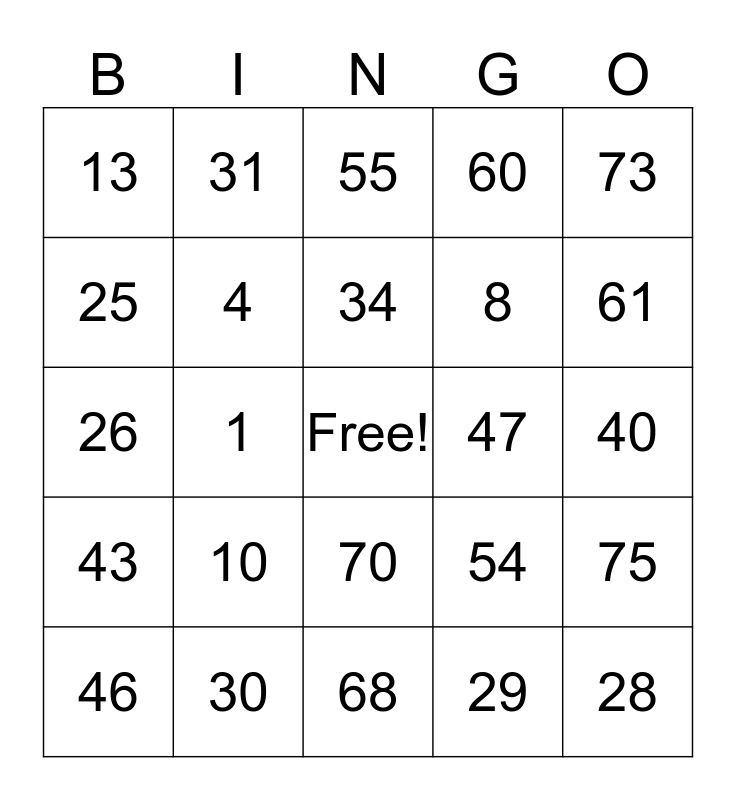 This bingo card has a free space and 24 words: 10, 30, 34, 46, 73, 13, 25, 31, 47, 70, 8, 26, 54, 75, 4, 29, 40, 55, 61, 1, 28, 43, 60 and 68.