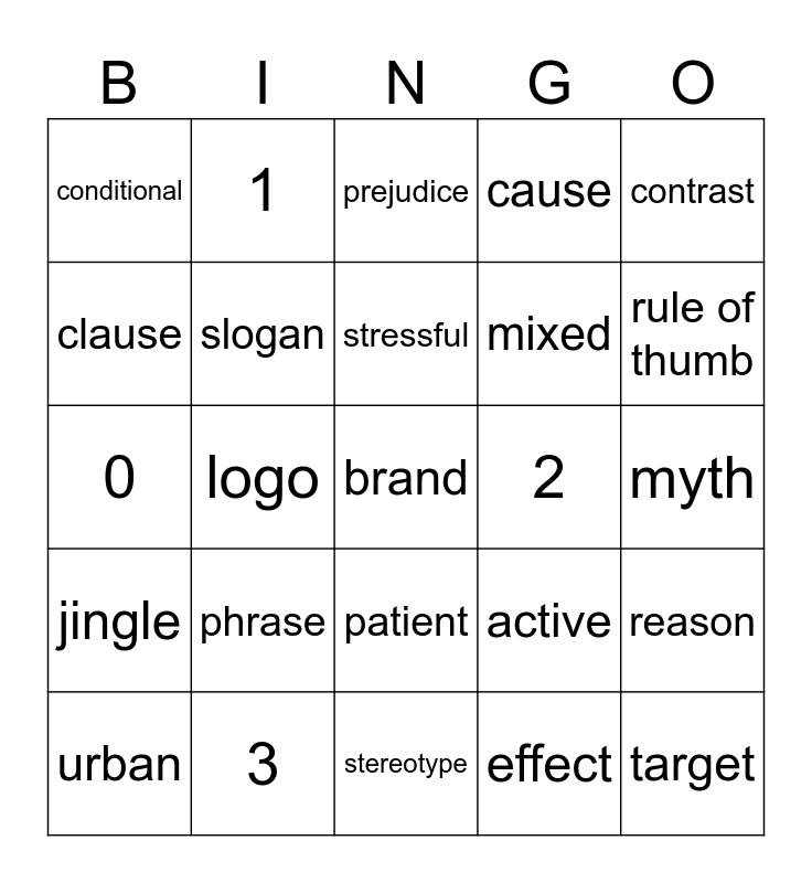This bingo card has a free space and 24 words: phrase, 3, stressful, urban, contrast, conditional, clause, 1, 2, patient, mixed, 0, active, reason, slogan, effect, myth, prejudice, rule of thumb, logo, target, jingle, cause and stereotype.