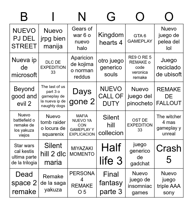 This bingo card has 40 words: PERSONA 4 REMAKE O 5, RE9 O RE 5 REMAKE o code veronica remake, BLOODBORN PC, Nueva ip de microsoft, Silent hill collecion, REMAKE DE FALLOUT, DLC DE EXPEDITION 33, silksong, GTA 6 GAMEPLAY, NUEVO CALL OF DUTY, Juego reciclado de ubisoft, Kingdom hearts 4, Beyond good and evil 2, Days gone 2, The last of us part 3 o gameplay de la nueva ip de naughty dogs, Nuevo juego del pinocheto, Crash 5, NUEVO PJ DEL STREET, Final fantasy parte 3, Gears of war 6 o nuevo halo, Nuevo tomb raider o locura de squarenix, The witcher 4 mas gameplay y unreal, Aparicion de kojima o norman reddus, Nuevo juego de pelea del lol, Nuevo juego de insomniac games, Half life 3, Silent hill 2 dlc maria, Nuevo juego triple AAA sony, Star wars cal kestis ultima parte de la trilogia, MIYAZAKI MOMENTO, Mario, zelda o algun exclusivo de switch, MAFIA NUEVO YA CON GAMEPLAY Y EXPLICACION, Dead space 2 remake, Nuevo battlefield o remake de los yakuza viejos, otro juego generico souls, OST DE EXPEDITION 33, juego generico de gadchat, Remake de la saga yakuza, Nuevo jrpg bien manija and Remake de la saga yakuza.