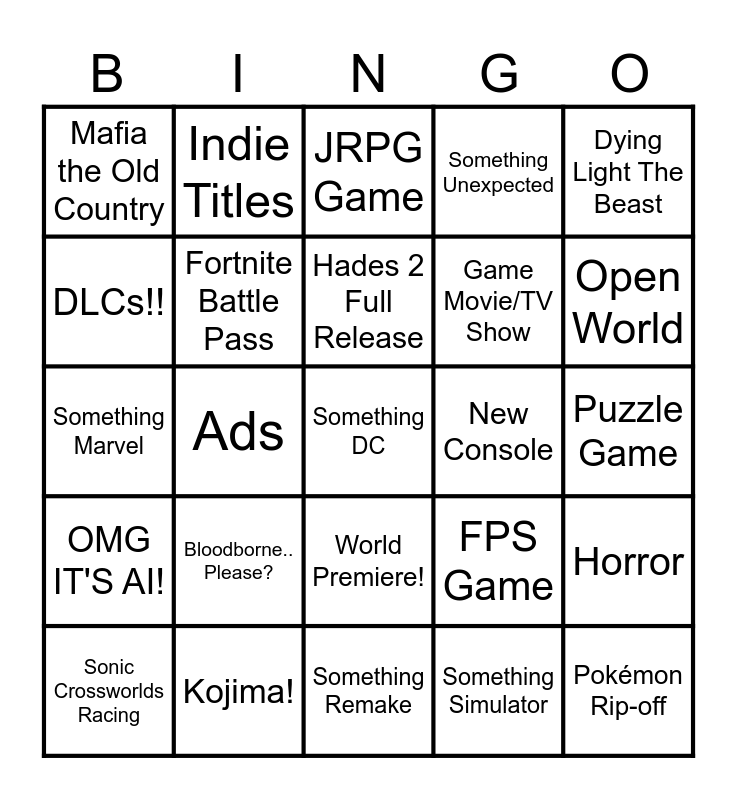 This bingo card has a free space and 24 words: Bloodborne.. Please?, Kojima!, Hades 2 Full Release, Sonic Crossworlds Racing, Dying Light The Beast, Mafia the Old Country, DLCs!!, Indie Titles, New Console, World Premiere!, Game Movie/TV Show, Something Marvel, FPS Game, Horror, Fortnite Battle Pass, Something Simulator, Puzzle Game, JRPG Game, Open World, Ads, Pokémon Rip-off, OMG IT'S AI!, Something Unexpected and Something Remake.