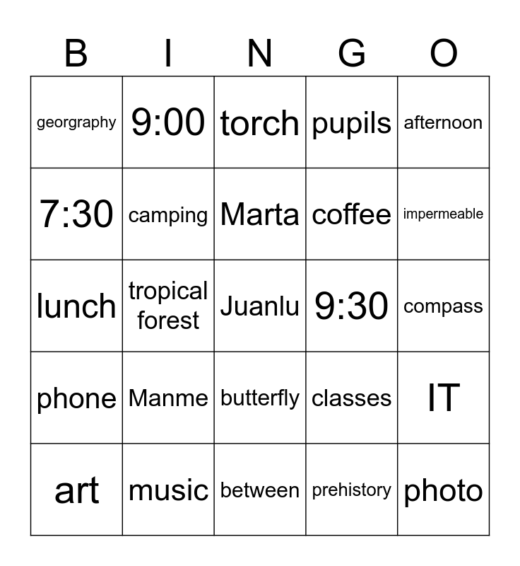 This bingo card has a free space and 24 words: Manme, music, Marta, art, afternoon, georgraphy, 7:30, 9:00, 9:30, butterfly, coffee, lunch, classes, IT, camping, prehistory, compass, torch, impermeable, tropical forest, photo, phone, pupils and between.
