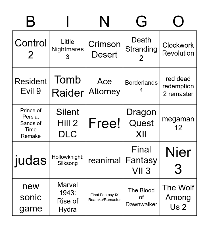 This bingo card has a free space and 49 words: Lies of P: Overture, The Wolf Among Us 2, Kingdom Hearts 4, Final Fantasy IX Reamke/Remaster, Hollowknight: Silksong, Persona 4 Remake, Little Nightmares 3, Half-Life 3, Resident Evil 9, BioShock 4, Tomb Raider, Death Stranding 2, Nier 3, Final Fantasy VII 3, Persona 6, Fromsoftware Game, Ace Attorney, Dragon Quest XII, Metal Gear Solid Collection Vol. 2, Clockwork Revolution, Silent Hill 2 DLC, The Blood of Dawnwalker, Control 2, Borderlands 4, max payne remake, red dead redemption 2 remaster, new sonic game, crash 5, reanimal, judas, new lego game, Wolverine, OD, Mass Effect, Marvel 1943: Rise of Hydra, Jet Set Radio, Splinter Cell remake, rayman, megaman 12, Bloodborne pc port, Star Wars Eclipse, twisted metal, Marvel's Blade, God of war spinoff or collection, Prince of Persia: Sands of Time Remake, Crimson Desert, battlefield 6, Subnautica 2 and new star wars game.