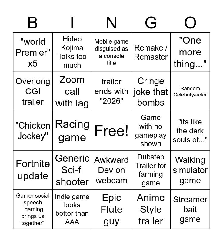 This bingo card has a free space and 24 words: Generic Sci-fi shooter, Indie game looks better than AAA, trailer ends with "2026", Gamer social speech "gaming brings us together", "One more thing...", "world Premier" x5, Overlong CGI trailer, Hideo Kojima Talks too much, Game with no gameplay shown, Awkward Dev on webcam, Cringe joke that bombs, "Chicken Jockey", Dubstep Trailer for farming game, Walking simulator game, Zoom call with lag, Anime Style trailer, "its like the dark souls of...", Mobile game disguised as a console title, Random Celebrity/actor, Racing game, Streamer bait game, Fortnite update, Remake / Remaster and Epic Flute guy.