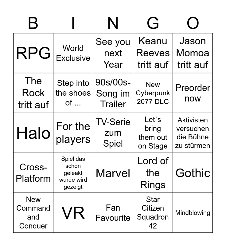 This bingo card has 107 words: Preoder Bonus, Seasonpass, For the players, Amazing, Day One Gamepass, This is the best game..., Fantastic, We heared you, Hideo Kojima und Geoff plaudern mal wieder auf der Bühne, Todd Howard preist irgendwas als das größte jemals an, Free to play, Quadrupple A, Gamepass Exclusive, Shadowdrod / Drop now, Redefining the genre, Geof ist unheimlich Stolz auf irgendwas, World Exclusive, First Look, Explore a living, breathing world, Next level, Spiel das schon geleakt wurde wird gezeigt, One last thing, A blend of ... and ..., Raytracing, Jack Black tritt auf, Jason Momoa tritt auf, The Rock tritt auf, Keanu Reeves tritt auf, Extraordinary, 4k 60fps, Mindblowing, VR, Nicolas Cage tritt auf, Mobile Game, New mechanics, See you next Year, Next Gen Experience, Revolutionary, A gamechanging experience, TV-Serie zum Spiel, Spiel zu TV-Serie, Endless replayability, Fan Favourite, Never seen before!, Highly anticipated, Step into the shoes of ..., The rumores were true, 90s/00s- Song im Trailer, Marke nimmt sich selbst auf den Arm, Let´s bring them out on Stage, A new Era of..., Preorder now, Cross-Platform, Playable demo, Open World, Indie, Strategie, Shooter, Action, RPG, MMO, Survival, Star Wars, Star Eclipse, Star Wars KOTOR Remake, Call of Duty, Bioware zeigt das neue Mass Effect, Gothic, Harry Potter, Lord of the Rings, Marvel, Halo, Star Citizen Squadron 42, Neues Resident Evil, GTA6, Lego, Anno, New XCOM, Batman, Death Stranding 2, Witcher 4, Exodus Becom the Traveler, Half-Life 3 (Wenn das zutrifft, gilt das als Bingo), Hallow Knight Silksong, Disney, Kingdom Hearts 4, New Starfield Addon, New Forza, New Bioshock, Cuphead 2, New Cyberpunk 2077 DLC, Persona 4 remake, New Pokemon, Minecraft 2, Little Nightmares 3, New Tomb Raider, New Command and Conquer, New Uncharted, Ghost of Tsushima 2 Teaser, Ubisoft legt eine PR Bruchlandung hin, Geoff Keighley Doku, Skyrim (15th) Aniversary Edition wird angekündigt, Publikum klatscht nicht, Jemand schreit aus dem Publikum laut XBOX, Publisher/Producer etc singt und oder tanzt auf der Bühne, Aktivisten versuchen die Bühne zu stürmen and Geoff Keighley im Hawaiihemd (gilt direkt als Bingo).