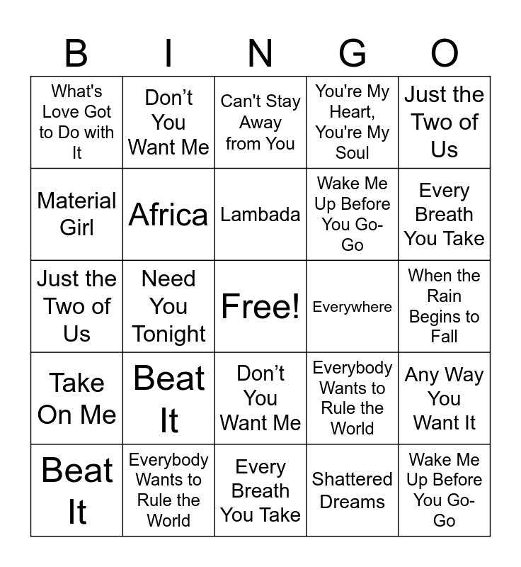 ⚠ This card has duplicate items: What's Love Got to Do with It (2), Wake Me Up Before You Go-Go (2), I Wanna Dance with Somebody (Who Loves Me) (2), Every Breath You Take (2), Beat It (2), Nothing’s Gonna Stop Us Now (2), Don’t You Want Me (2), Take On Me (2), Material Girl (2), I Want to Break Free (2), Africa (2), You're My Heart, You're My Soul (2), Any Way You Want It (2), Everybody Wants to Rule the World (2), When the Rain Begins to Fall (2), I Want to Know What Love Is (2), Lambada (2), Everywhere (2), Can't Stay Away from You (2), Just the Two of Us (2), Need You Tonight (2), Shattered Dreams (2)