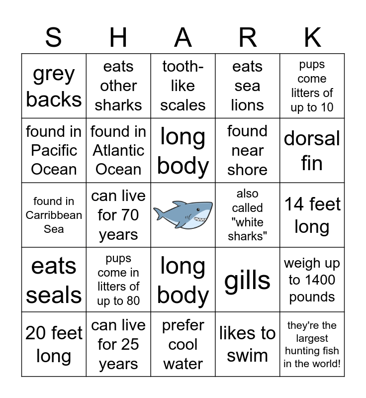 This bingo card has a free space and 55 words: white belly, 20 feet long, weigh up to 5000 pounds, grey backs, prefer cool water, found in Pacific Ocean, found in Atlantic Ocean, found in Indian Ocean, found near shore, eats seals, eats sea lions, eats dolphins, catches prey by jumping out of water, hunts alone, feeds in groups, give birth to pups, pups come litters of up to 10, can live for 70 years, have 3000+ teeth, they're the largest hunting fish in the world!, also called "white sharks", dorsal fin, gills, tooth-like scales, cartilage skeleton, long body, likes to swim, white belly, 14 feet long, weigh up to 1400 pounds, brown backs with stripes, prefer warm water, found in Atlantic Ocean, found in Gulf of Mexico, found in Pacific Ocean, found in Carribbean Sea, eats sea snakes, eats seals, eats turtles, eats squid, eats other sharks, eats garbage, hunts alone, gives birth to pups, pups come in litters of up to 80, can live for 25 years, nicknamed "wastebasket of the sea", heart-shaped teeth, also called "leopard sharks", dorsal fin, gills, tooth-like scales, cartilage skeleton, long body and likes to swim.