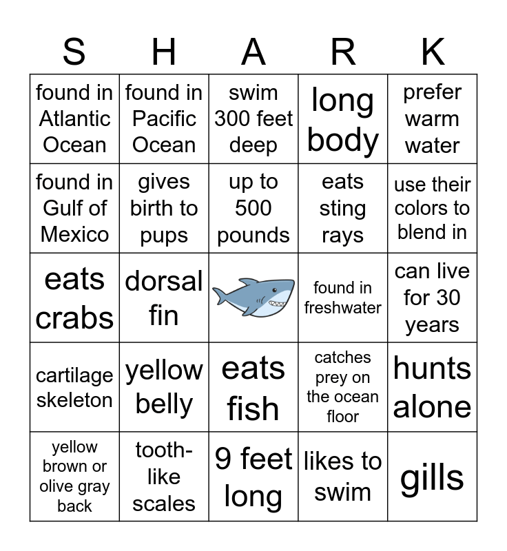 This bingo card has a free space and 25 words: yellow belly, 9 feet long, up to 500 pounds, yellow brown or olive gray back, prefer warm water, found in Atlantic Ocean, found in Gulf of Mexico, found in Pacific Ocean, found in freshwater, eats fish, eats sting rays, eats crabs, catches prey on the ocean floor, hunts alone, gives birth to pups, pups come in litters of up to 17, can live for 30 years, swim 300 feet deep, use their colors to blend in, dorsal fin, gills, tooth-like scales, cartilage skeleton, long body and likes to swim.