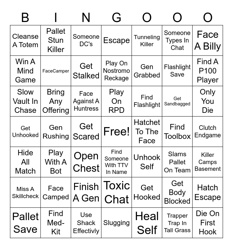 This bingo card has a free space and 48 words: Get Hooked, Flashlight Save, Slugging, Gen Rushing, Face Against A Huntress, Clutch Endgame, Pallet Stun Killer, Find Med-Kit, Someone Types In Chat, Find Someone With TTV In Name, Face A Billy, Escape, Get Sandbagged, Find Flashlight, Miss A Skillcheck, Find Toolbox, Win A Mind Game, Find A P100 Player, Get Body Blocked, Tunneling Killer, Gen Grabbed, Get Scared, Cleanse A Totem, FaceCamper, Hatch Escape, Get Stalked, Only You Die, Pallet Save, Play On RPD, Bring Any Offering, Trapper Trap In Tall Grass, Hatchet To The Face, Killer Camps Basement, Face Camped, Get Unhooked, Unhook Self, Slams Pallet On Team, Slow Vault In Chase, Open Chest, Finish A Gen, Hide All Match, Die On First Hook, Someone DC's, Use Shack Effectivly, Play On Nostromo Reckage, Toxic Chat, Play With A Bot and Heal Self.