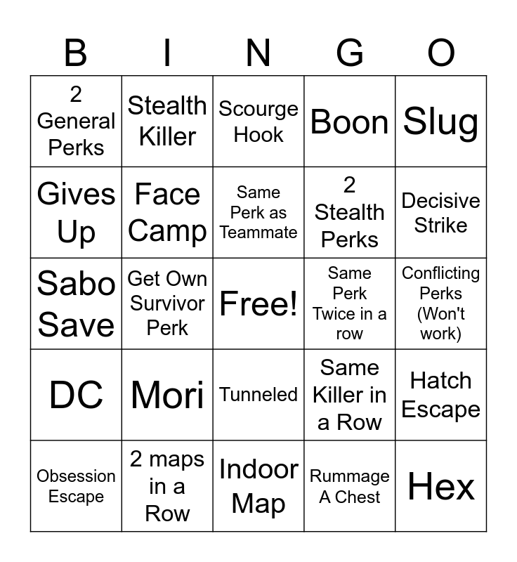 This bingo card has a free space and 37 words: 2 Perks From same Character, Exhaustion Perk, Gen Regression Perk, Face Camp, Hatch Escape, Mori, Same Perk as Teammate, No Mither, Slug, Map Offering, Get Own Survivor Perk, Boon, Hex, Conflicting Perks (Won't work), Gives Up, DC, Double Exhaustion, Scourge Hook, Tunneled, Same Perk Twice in a row, 2 General Perks, Decisive Strike, Obsession Escape, Indoor Map, 2 Aura Reading Perks, Rummage A Chest, Stealth Killer, Invocation, Save (Flash, Pallet), 4 man Escape, Killer Perk Expose, 2 maps in a Row, Sabo Save, Self Getup from Hit down, Same Killer in a Row, 2 Stealth Perks and Best / IRI Addons.