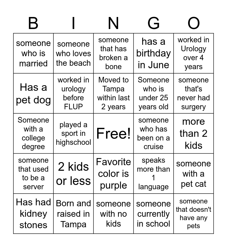 This bingo card has a free space and 24 words: 2 kids or less, Born and raised in Tampa, Moved to Tampa within last 2 years, Has had kidney stones, worked in Urology over 4 years, someone who is married, Has a pet dog, someone who loves the beach, someone who has been on a cruise, Favorite color is purple, Someone who is under 25 years old, Someone with a college degree, speaks more than 1 language, someone with a pet cat, worked in urology before FLUP, someone currently in school, more than 2 kids, someone that has broken a bone, someone that's never had surgery, played a sport in highschool, someone that doesn't have any pets, someone that used to be a server, has a birthday in June and someone with no kids.