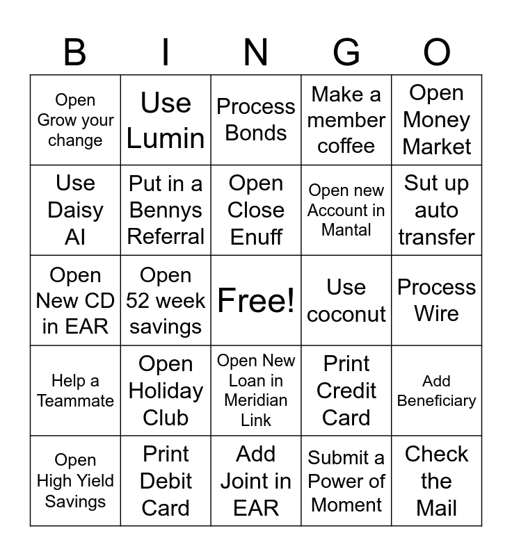 This bingo card has a free space and 24 words: Open Holiday Club, Print Debit Card, Open Close Enuff, Open High Yield Savings, Open Money Market, Open Grow your change, Use Daisy AI, Use Lumin, Use coconut, Open New Loan in Meridian Link, Open new Account in Mantal, Open New CD in EAR, Print Credit Card, Add Beneficiary, Put in a Bennys Referral, Submit a Power of Moment, Process Wire, Process Bonds, Sut up auto transfer, Open 52 week savings, Check the Mail, Help a Teammate, Make a member coffee and Add Joint in EAR.